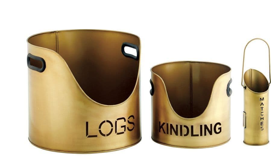 Set of 3 Log/Kindling & Match Holder Antique Brass